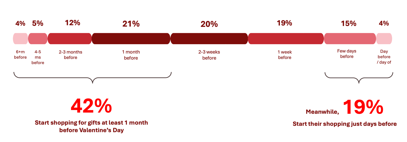 According to the above timeline, timing plays a critical role. Data shows that 42% of users begin shopping at least a month before Valentine’s Day, while 19% decide in the final days.